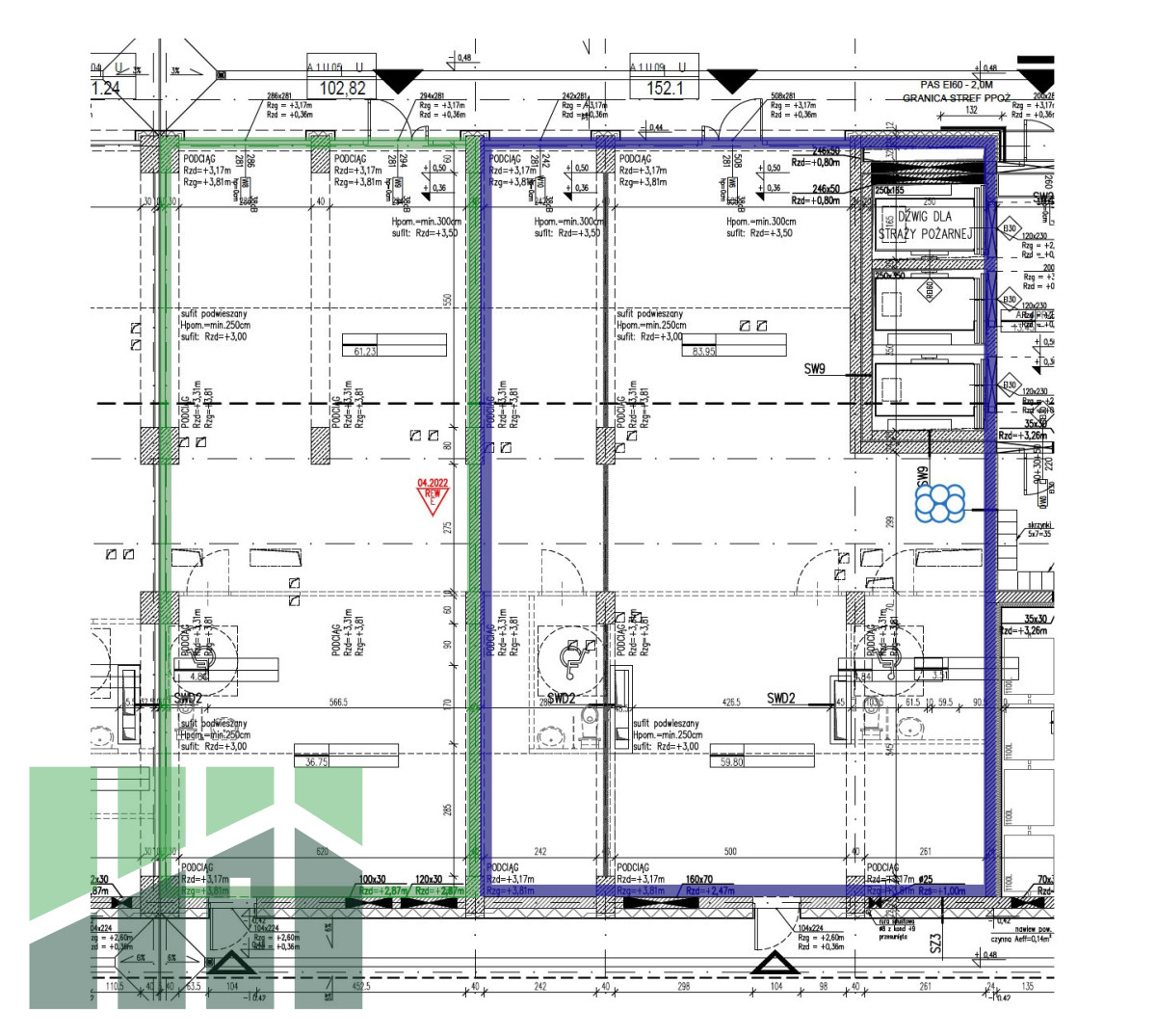 Powierzchnia lokalu 102m82 m2 (na rzucie oznaczony na zielono), możliwość zakupu większego lokalu o powierzchni 152m2 (na rzucie oznaczony na niebiesko)